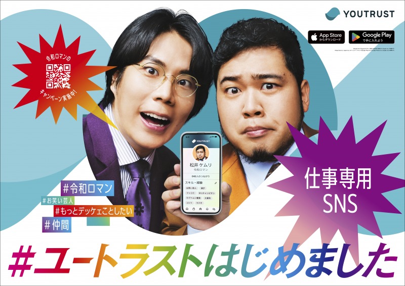 仕事専用SNS『YOUTRUST』の新WebCMに、令和ロマンさん、森香澄さん、ヒカキンさんの3組が登場しました。CMタイトルは「#ユートラストはじめました」で、4月6日から公開されています。『YOUTRUST』は、仕事仲間とのつながりづくりやプロフィール掲載、タイムライン投稿、副業や転職意欲の共有などを通じて新たな出会いを生み出す“仕事専用SNS”です。ビジネス系SNSに興味がある人にとってイメージしやすい内容になっています。