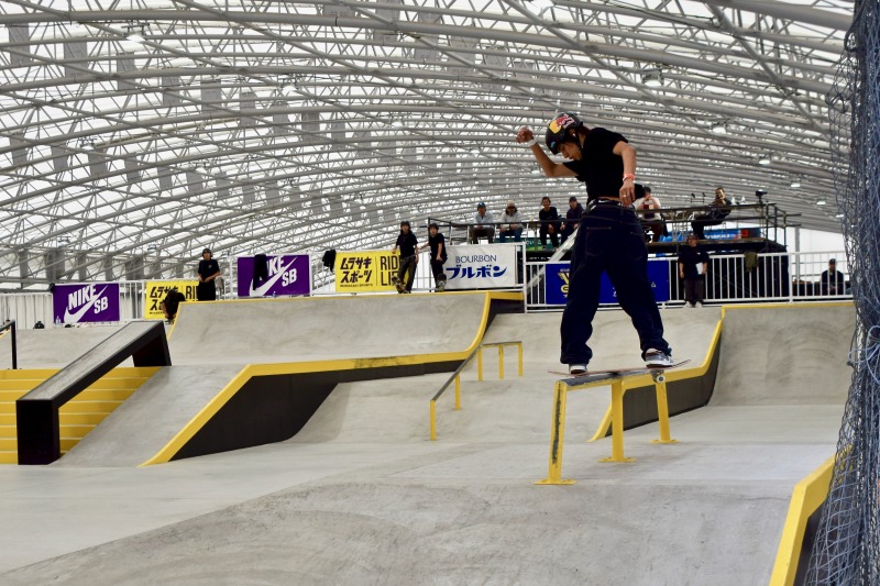 ラン1本目、2本目はフルメイク(ミスなく滑ること)を見せるものの、ファーストトリックのバックサイドハリケーングラインドはトラック部分がレールにかかっておらず53.68点止まり。