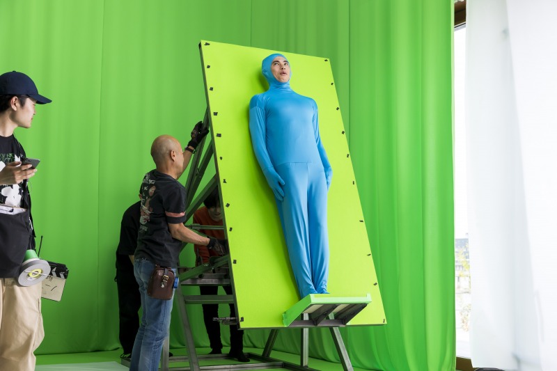 やがて表情も和らぎ、「わー!」と声を上げて台に乗りながらの撮影を楽しむ⼀幕も。その後は、撮影の合間に⿐歌を⼝ずさむほどリラックスした表情を⾒せ、本番では「台が動く途中でニコッとしてください」という、タイミングが難しい演技指⽰にも⼀発OKで応え、監督からは「素晴らしい!」と称賛の声が漏れました。回転台の上で「ウェーイ!」と叫ぶシーンの撮影後には、「こんな⼤掛かりなセットの中でウェーイ!をしたことがないので、今までにない、渾⾝のウェーイ!が出ました」と笑顔で語りました。