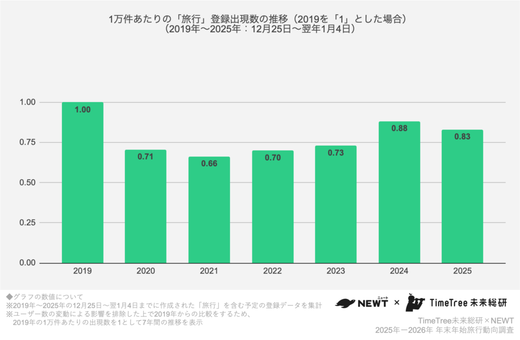 TimeTreeに登録された予定データから、2019年以降7年間における年末年始(12月25日~翌年1月4日)の「旅行」予定の推移を分析した結果、2025年の年末年始の旅行予定登録数は2019年比で83%となりました。一時期はコロナ禍の影響で大きく減少しましたが、2022年以降は回復基調に転じ、2023年73%、2024年88%と上昇を続けてきました。2025年は前年を5ポイント下回ったものの、コロナ前の8割超の水準を維持しており、回復基調は継続しています。一方で、物価高や宿泊費の上昇を背景に、日本人の旅行需要の伸びはやや鈍化しつつあるようです。