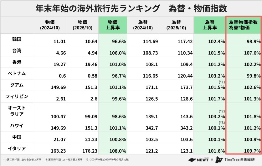 直近1年間の為替変動と物価上昇率から、旅行先の「コスパ」を分析した結果、もっとも費用対効果が高いのは韓国という結果になりました。もともと若年層に人気の行き先でしたが、ウォンに対する円の相対的な安定や現地物価の伸びが比較的穏やかなことが理由とされています。4位のベトナムも物価の大幅な上昇が見られず、為替物価指数が100%を下回るなど、依然として“コスパの良い海外旅行先”として魅力が続いています。