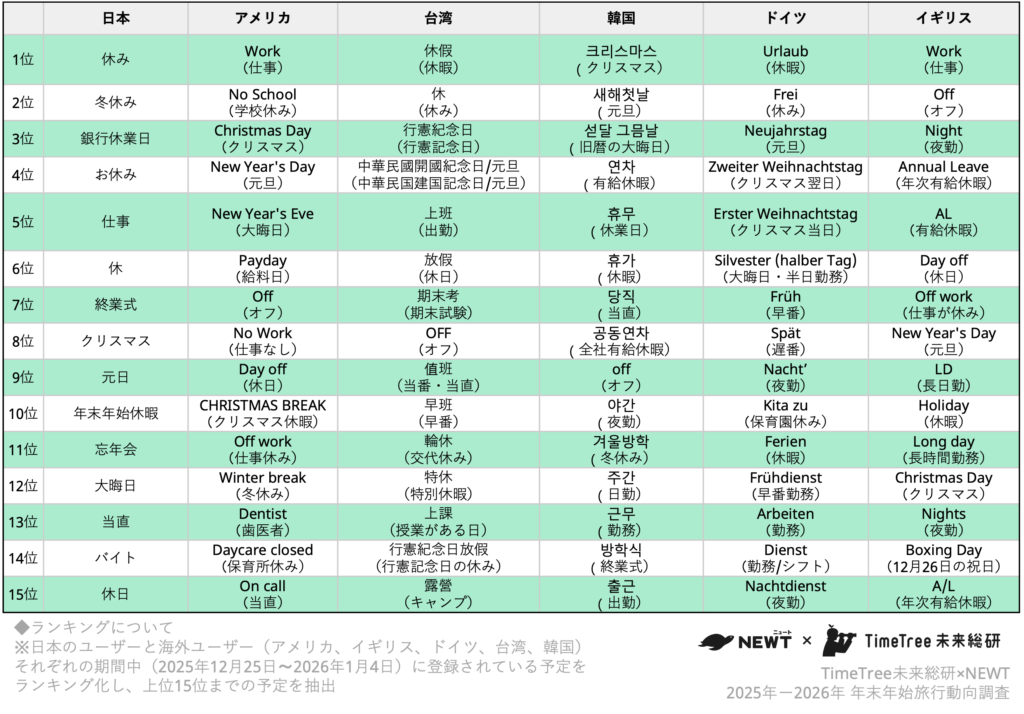 今回の調査で最もユニークだったのは、世界6カ国の年末年始の予定ワードを比べると、日本だけが「銀行休業日」を予定に入れているという点。年末年始に銀行が一斉休業する日本ならではの習慣と、現金文化の根強さが予定データにも表れています。アメリカやイギリスでは年末年始でも「Work(仕事)」が上位に登場し、台湾や韓国では学校行事が目立つなど、各国の文化や生活の違いが鮮やかに浮かび上がりました。