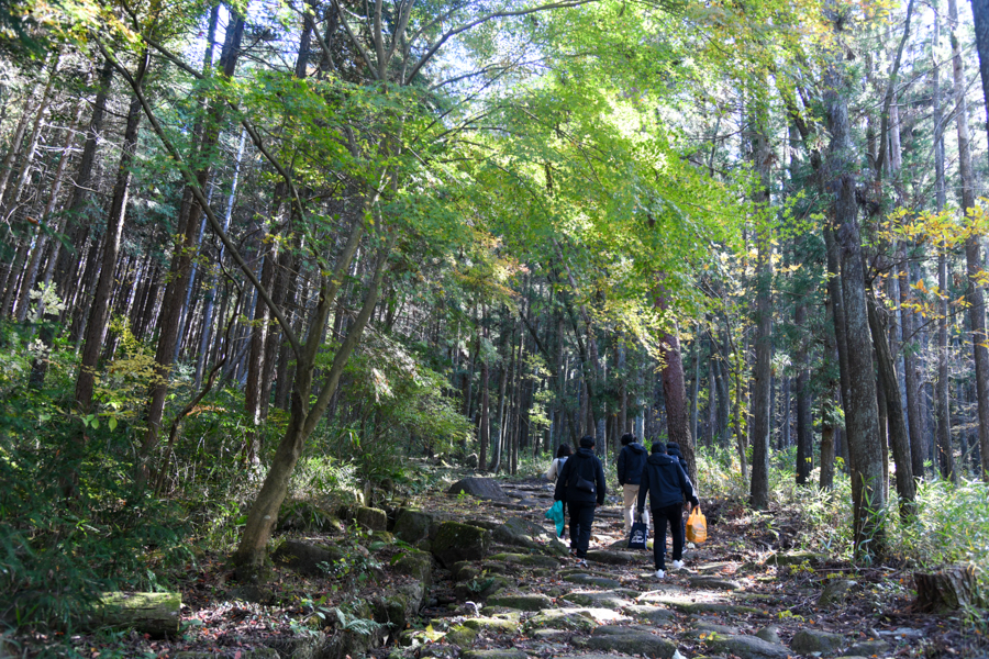 御嶽宿を後にして車で30分ほど移動した一行は、瑞浪市の「琵琶峠」で中山道の石畳道をプチトレッキング。現地に着くまでの間、山間地に分け入っていく車中からの景色はだんだんと秋色に染まり、里っぽい風景へと移り変わっていく。