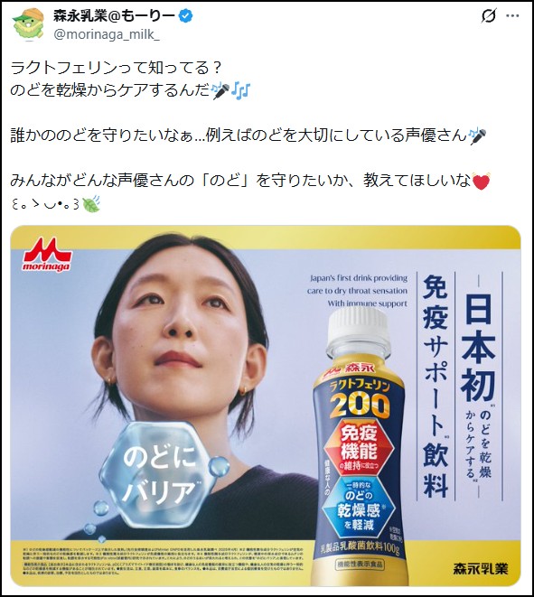 本企画のきっかけは、森永乳業公式Xアカウント「@もーりー」による「ラクトフェリンで、声優さんの“のど”を守りたい」という何気ない投稿でした。するとSNS上には、「推し声優ののどを守ってほしい」という声が続々と集まり、大きな盛り上がりとなりました。