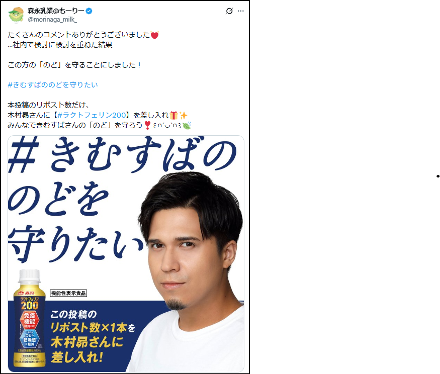 そんな中、森永乳業は2026年1月19日(月)より、声優として日々声を使い続ける木村昴さんを応援する企画「#きむすばののどを守りたい」をスタートさせました。本キャンペーンは、X(旧Twitter)上で指定のキャンペーン投稿がリポストされるごとに、木村昴さんに森永乳業の機能性表示食品『森永ラクトフェリン 200 ドリンクタイプ』が、差し入れとして届けられるというファン参加型キャンペーンです。