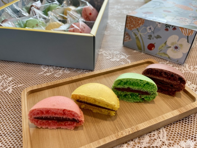 箱を開けた瞬間、思わずかわいい!と声が出るカラフルなマカロン。ピンク色の「フランボワーズ」はきゅんと甘酸っぱく、黄色の「アプリコットバナナ」はフルーティーでまろやか。緑色の「洋梨」はみずみずしい香りが広がり、茶色の「カフェ」はほろ苦さもある大人の味わい。ガナッシュクリームは濃厚で、外側のさっくり感と内側のしっとり感のコントラストが心地よい仕上がりです。春らしい彩りは、ギフトとしての“映え”も間違いなし。