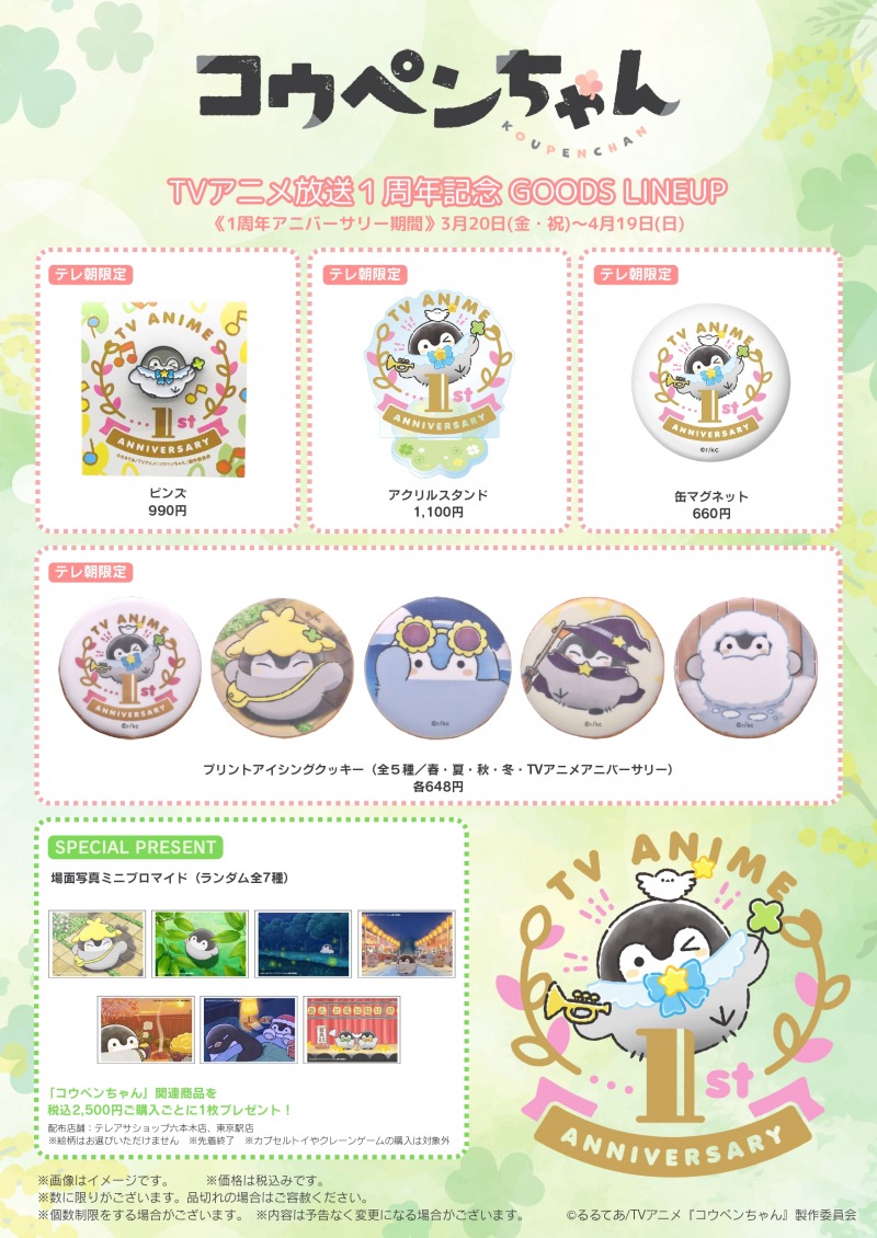 この期間には、新規描き下ろしの1周年記念ロゴがさまざまな場所に登場するほか、記念グッズも登場。テレビ朝日の公式ショップ「テレアサショップ」(オンライン含む)では、アニバーサリー仕様のピンズやアクリルスタンド、缶マグネットなどが販売されます。さらに、コウペンちゃんと過ごした“春夏秋冬”をテーマにした「プリントアイシングクッキー」など、思わず写真を撮りたくなるようなかわいらしいアイテムもラインナップされています。