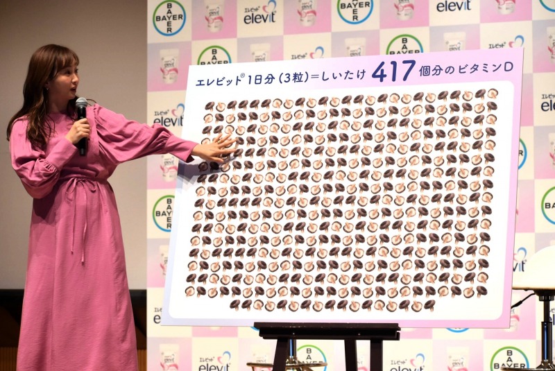 続いて、1日に必要なビタミンDの量を生しいたけに置き換えた“可視化ボード”が登場。1日に必要な25マイクログラムのビタミンDを生しいたけで摂ろうとすると、必要量はなんと417個分。これがエレビット3粒(1日推奨量)に含まれている。